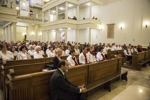 „Dicséret és dicsőség légyen tenéked magasságban, dicséret és tisztesség az anyaszentegyházban” – a megnyitó ünnepség végén a résztvevők közösen énekelték a 196. dicséretet, melyet Oláh Gábor vezényelt és orgonán kísért Bódiss Tamás.